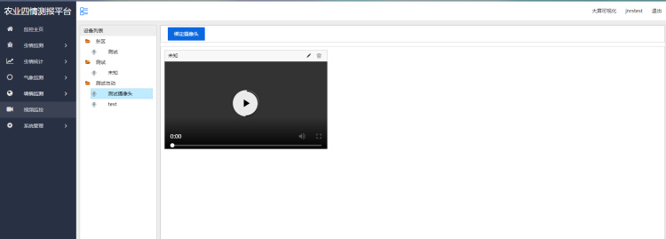 監(jiān)控主頁(yè)顯示設(shè)備列表、大屏可視化、地圖展示等菜單信息。顯示土壤墑情、蟲(chóng)情、氣象監(jiān)測(cè)圖標(biāo)及設(shè)備的運(yùn)行狀態(tài)。